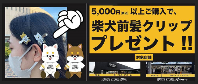 HAWKS STORE HOME、HAWKS STORE ANNEXで、税込5,000円以上の商品をご購入のお客様に先着で500名様に「柴犬前髪クリップ」のプレゼントキャンペーンを実施します!