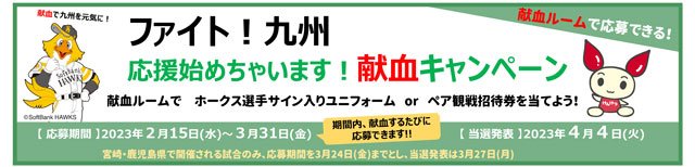 2月15日(水)から3月31日(金)までの期間中、九州・沖縄の献血ルームにて献血いただいた方は、「ファイト!九州」アンバサダー選手のサイン入りユニフォームや「ファイト!九州デー」ペア観戦招待券が当たる抽選に応募できます。