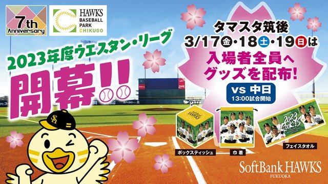3月17日(金)~19日(日)の3日間は、2023シーズンのオープニングイベントとして入場者全員へタマスタ筑後オリジナルグッズを配布します!