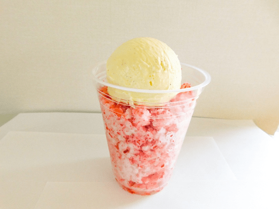 凍らせて削った、地元産のあまおう苺の上にアイスクリームを豪快にON☆苺の酸味とアイスクリームの甘さが絶妙で、遠方からのファンも多数!この機会にご賞味ください♪