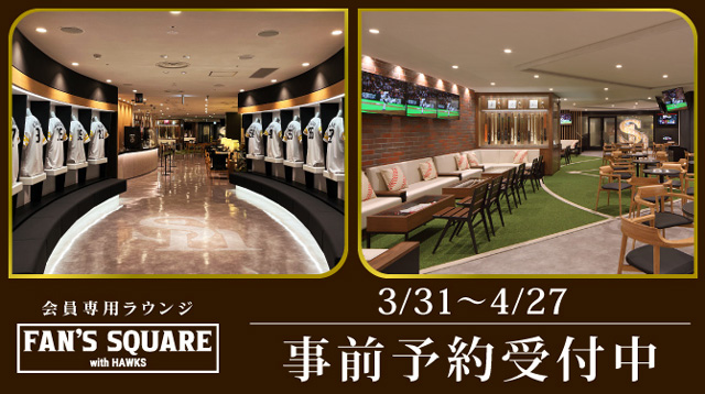タカポイントでは、当日の観戦チケットをお持ちのダイヤモンド・プラチナステージ会員を対象に、3月31日(金)~4月27日(木)にPayPayドームで開催される公式戦における会員専用ラウンジ「FAN’S SQUARE」事前予約の抽選受付を開始いたします。