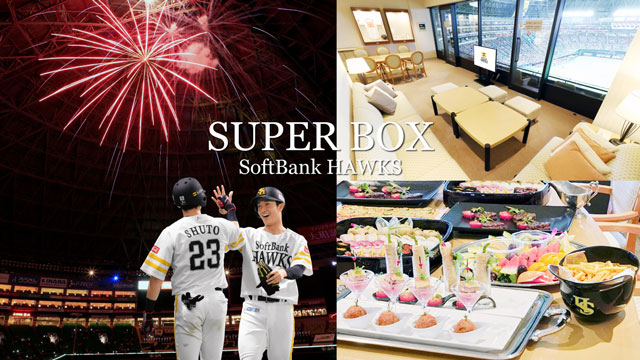 「PayPayドームの貴賓室」スーパーボックスは、お食事を楽しみながら、野球観戦ができる特別なプライベート空間です。ドーム全体が見渡せるバルコニー席からは、スタンド席では体験できない試合の熱気や勝利の花火をお楽しみいただけます。