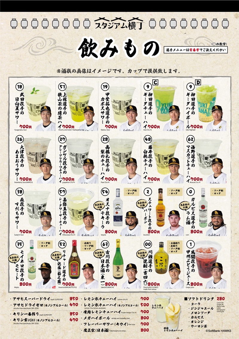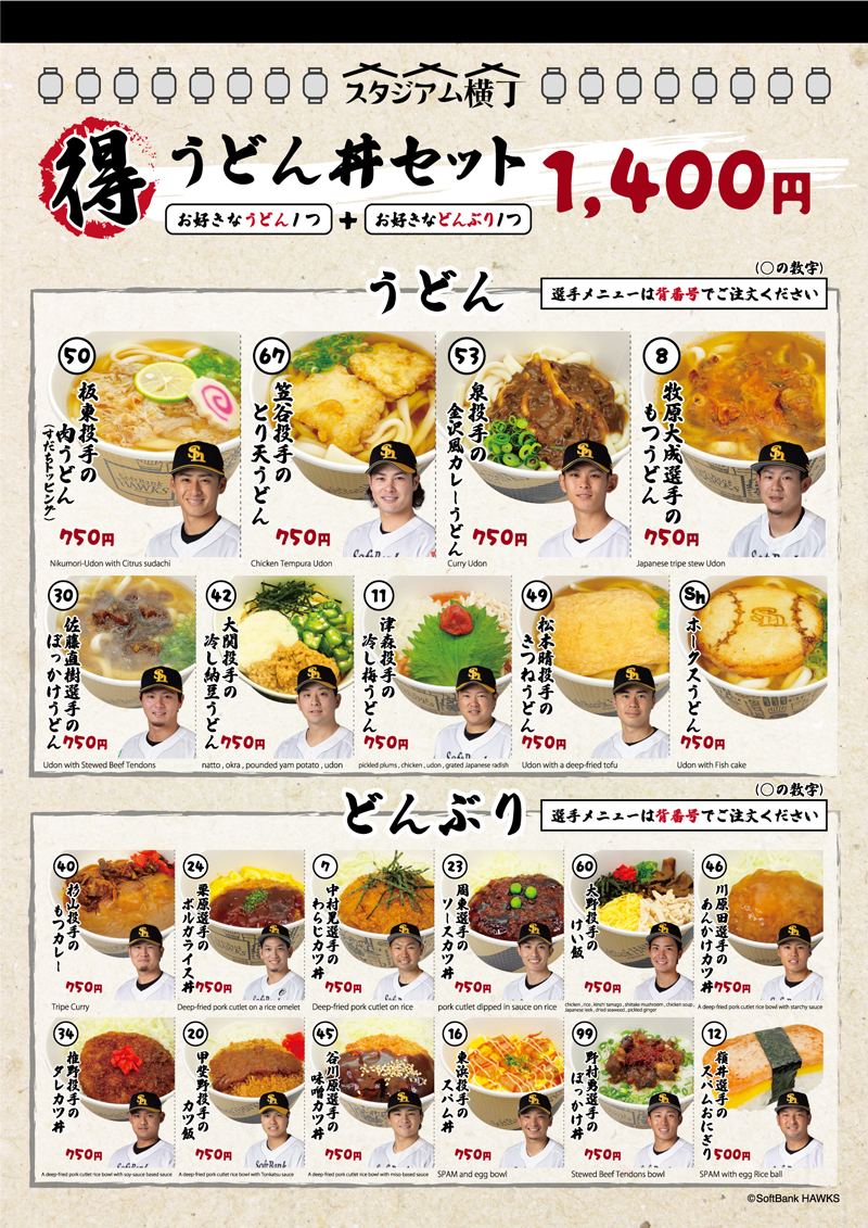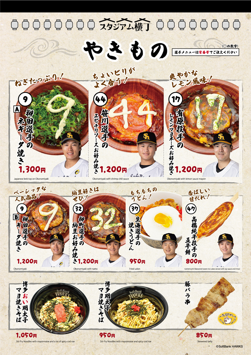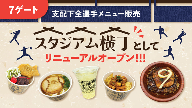 7ゲート「スタジアム横丁」がホークス支配下全選手グルメが揃うお店としてリニューアルOPEN!!選手の出身地の名物や名産を選手グルメとして販売します。今までにはない小さいサイズで楽しめるセットグルメやスイーツ、野球観戦には欠かせないアルコールも豊富に取り揃えております。リニューアルした「スタジアム横丁」で食べて飲んでホークスを応援しよう!!