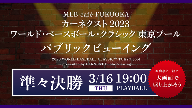 BOSS E・ZO FUKUOKA 3F「MLB café FUKUOKA」では、3月16日(木)に東京ドームで開催されるカーネクスト 2023 ワールド・ベースボール・クラシック 東京プール パブリックビューイング(準々決勝)を開催いたします!120インチを超える大画面スクリーンと充実した音響設備の中で白熱した試合を観戦しませんか?みんなで一緒に盛り上がりましょう!