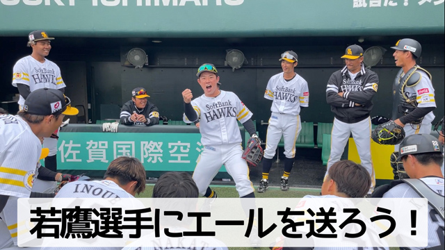 試合で奮闘する若鷹選手を現地(タマスタ筑後)・ホークスTVで観戦しながらオンラインで選手にエールを送ろう!いただいたエールはタマスタ筑後のビジョンに掲出します!さらに、たくさんの特典もご用意しました。