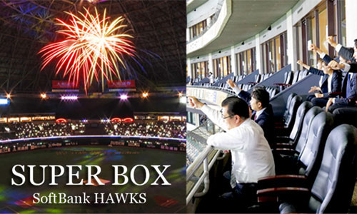 「PayPayドームの貴賓室」スーパーボックスは、お食事を楽しみながら、野球観戦ができる特別なプライベート空間です。ドーム全体が見渡せるバルコニー席からは、スタンド席では体験できない試合の熱気や勝利の花火をお楽しみいただけます。