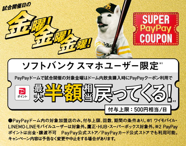 また、“ソフトバンク”のスマートフォンをご利用のPayPayユーザーには、PayPayドーム内の対象加盟店で飲食物の購入時に使える「スーパーPayPayクーポン」(※1)も発行します。「スーパーPayPayクーポン」の利用で、決済金額の最大半額(付与上限:500ポイント、1日当たりのクーポン使用回数上限:1回)相当のPayPayポイントが後日付与されます。