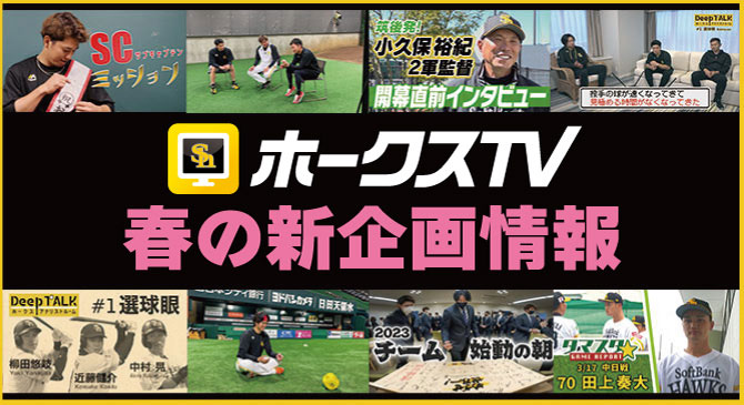 2023年のホークスTV新企画が続々スタートしています!今季は“野球深堀り企画”が充実。ホークス球団データ班が導いたデータをもとに選手たちが極上トークを繰り広げる『Deep TALK~ホークスアナリストルーム~』など、新企画が目白押しです。さらに、今季はホークスTVのご視聴でタカポイントがたまります!3月31日(金)までの新規ご入会で一か月間無料なので、この機会にぜひホークスTVのオリジナル番組をご覧ください。