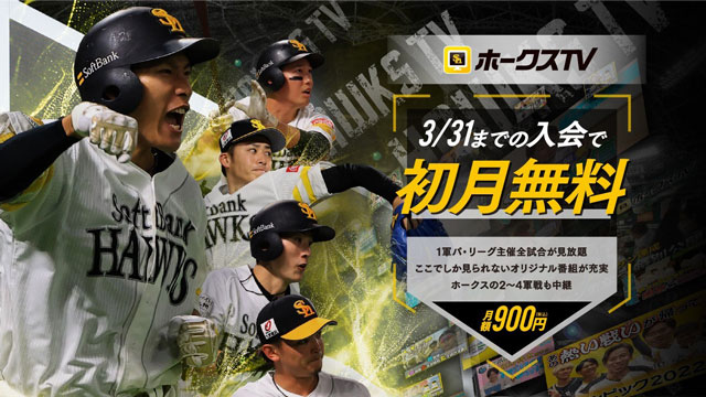 球団公式動画配信サービス「ホークスTV」では、2023年3月31日(金)までの入会で初月無料のキャンペーンを実施中です。1軍パ・リーグ公式戦は全試合見放題!セ・パ交流戦やクライマックスシリーズも視聴いただけるほか、2~4軍戦も生配信・見逃し配信をお楽しみいただけます。この機会にぜひホークスTVをお楽しみください!