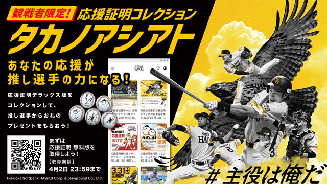 宮崎キャンプにて好評だった「応援証明コレクション」(通称:タカノアシアト)の実証実験の第2弾を3月31日(金)の開幕戦で実施します♪また、応援証明デラックス版を保有している方の中から抽選で、開幕戦の試合球の直筆サインボールをプレゼントします。推し選手の応援証明デラックス版を集めて、直筆サインボールを当てよう!