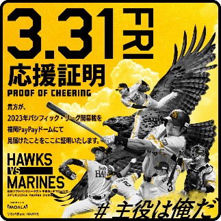 3月31日(金)の開幕戦に来場された方に、その記録となる「応援証明」を無料配布します!「ハリーとハニー」「ふうさんとこふうさん」「#主役は俺だ」のキービジュアル、計3種類のデザインが全てもらえます☆