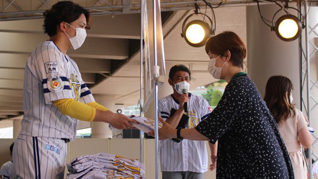 ステージに上がると目の前にはホークスの選手が♪ファイト!選手から九州2023ユニフォームを手渡しでもらえる人気チケットを販売します。渡してくれた選手が試合で活躍すれば気分は最高潮!推し選手が増えること間違いなしのイベントにぜひ参加してください。