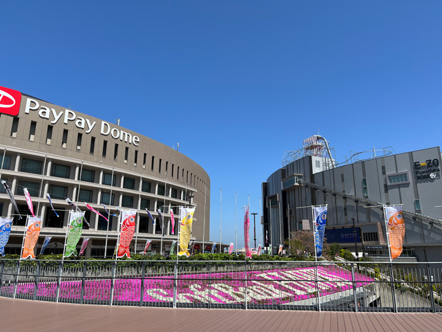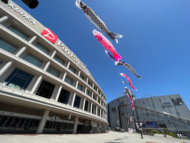 PayPayドームとBOSS E・ZO FUKUOKAの前には福岡市最大級「鯉のぼりの道 よんももち」が4月10日(月)より登場!6階イベントホールでは、4月29日(土・祝)より『Immersive Museum FUKUOKA』を開催♪5月5日(金・祝)~7日(日)は「ドーム開業30周年 PayPayドームフィールド開放」も実施します!