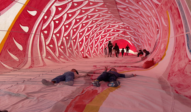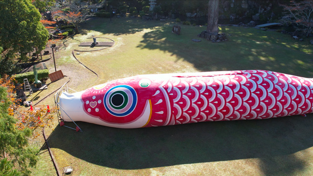 童話の里・大分県玖珠町で毎年5月5日に開催される日本童話祭の目玉でもある“ジャンボこいのぼりくぐりぬけ”。全長35メートルの巨大なこいのぼりの口からしっぽへくぐりぬける貴重な体験をしよう!
