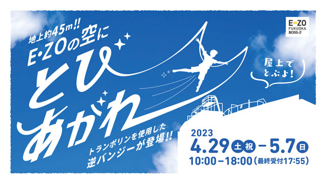 地上約40mの屋上からトランポリンを用いた「逆バンジー」を体験いただけます。とんだ高さは、なんと地上約45m!福岡市内の街並みや、博多湾の景色など、まさに「絶景」をお楽しみください。とぶZOでE・ZOの空に「とびあがれ!」