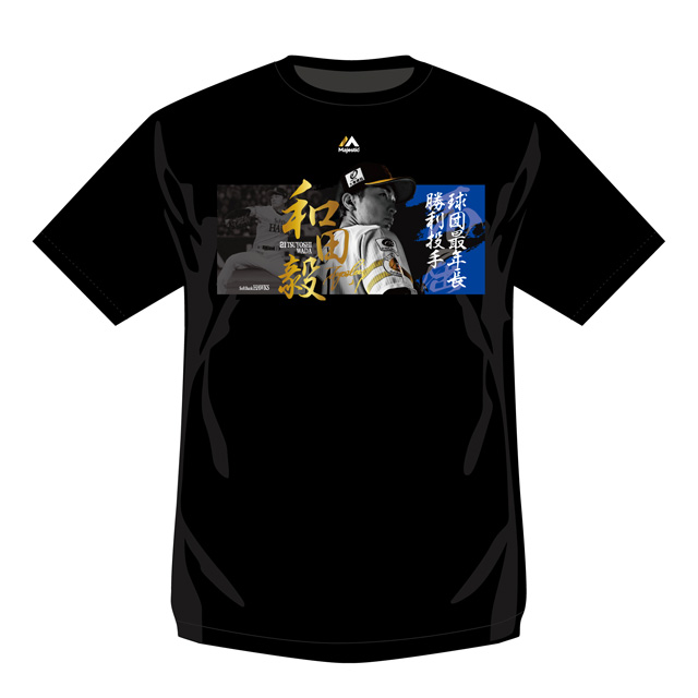 和田毅投手が4月5日(水)のオリックス・バファローズ戦で今季初勝利を挙げ、球団最年長勝利投手記録を達成しました!これを記念し、Tシャツやフェイスタオルなどの定番商品をはじめとしたグッズを発売します。和田投手の選手カラーであるブルーと、記録の重みを表すゴールドが渋くてクールなビジュアルに仕上がっています。受注期間は、4月17日(月)までですので、お見逃しなく。