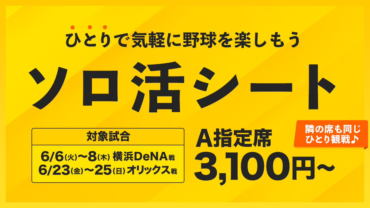 ソロ活派の皆さん、必見です!自分だけの時間を存分に楽しむ「ソロ活」を、球場で満喫できる「ソロ活シート」が誕生!となりの方もソロ活中という新しいスタイルの中で、迫力のスタジアム観戦を心ゆくまでお楽しみください。「ソロ活シート」は4月15日(土)10:00より販売します。枚数限定販売につきご購入はお早めに!