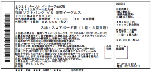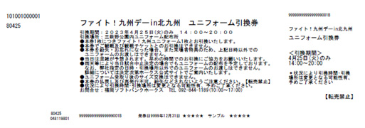 セブンチケットでのチケット購入者は、ユニフォーム引換確認欄に受取済印が押されていないチケット右側の半券(小さい方)をお持ちいただければ、ファイト!九州2023ユニフォームをお渡しいたします。