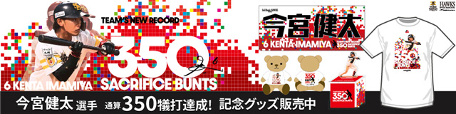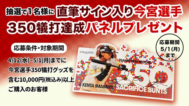 HAWKS STORE 各店とHAWKS公式オンライストアでは、今宮選手通算350犠打達成記念グッズを含む、税込10,000円以上をご購入のお客様の中から抽選で1名様に、直筆サイン入りの「記録達成パネル」が当たるキャンペーンを実施します!