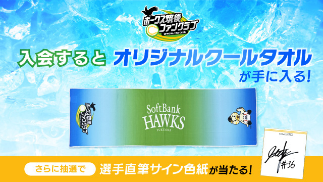 ホークス筑後ファンクラブに新規入会の先着600名に、これからの季節にぴったりの「オリジナルクールタオル」を1枚プレゼントするキャンペーンが5月15日(月)からスタート♪さらに、抽選で若鷹選手の直筆サイングッズが当たるチャンスも!ホークス筑後ファンクラブに新規入会して、若鷹選手を応援してください!
