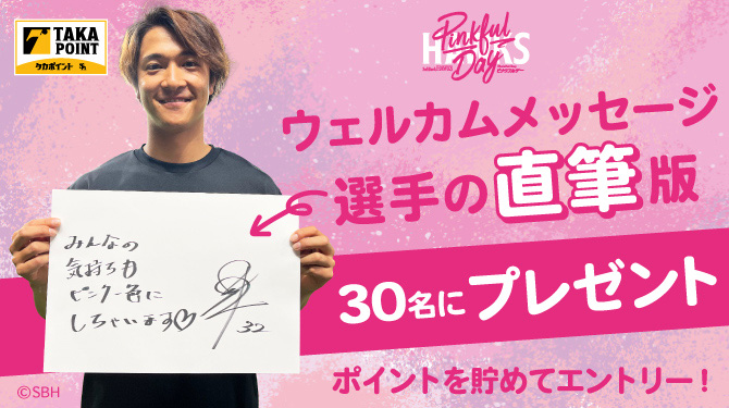 タカポイントでは、ピンクフルデーで展示される選手からのウェルカムメッセージの本人直筆版(A3サイズ)を抽選で30名にプレゼントするキャンペーンを開催します。応募資格は期間中にタカポイントを1,500pt以上貯めて簡単なアンケートに回答するだけです。この機会にぜひ参加してみてください☆