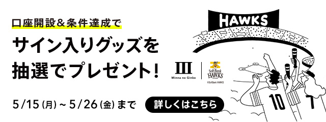 ホークスの日本一奪還を祈念して、みんなの銀行によるホークス応援Boxキャンペーンを開催中!第2弾のキャンペーンでは、新規口座開設者のうち条件を達成した方の中から抽選で、選手直筆サイン入りグッズが当たります。ぜひこの機会にみんなの銀行口座を開設して、素敵な景品をゲットしましょう!