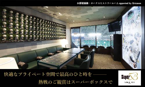 PayPayドームで開催されるホークス主催公式戦7月4日(火)~7月30日(日)の「ホークスヒストリールームsupported by Ericsson」・「CHAMPAGNE COLLET ラグジュアリー パーティールーム」と「SUPER BOX(スーパーボックス)」の販売を、5月27日(土)より開始します!