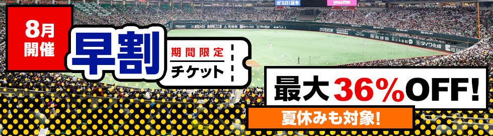 早く買えばホークス戦のチケットが最大36%OFF!PayPayドーム開催8月公式戦11試合の早割チケットを6月3日(土)10:00から販売開始♪6月24日(土)までの期間枚数限定販売につきご購入はお早めに!