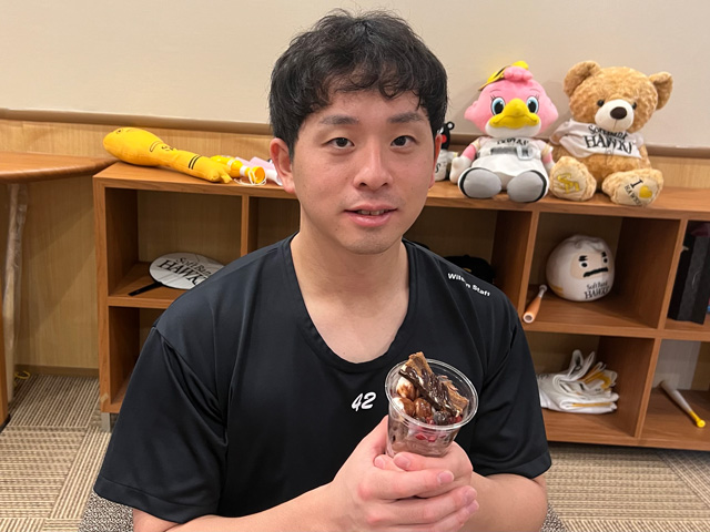 大関投手のリクエストから大好きなチョコをふんだんに使ったパフェが完成!!開発段階から自ら食材を選び作ったチョコレートパフェは食べる価値あり!こだわりの白玉を乗せ大関投手も「僕は美味しいと思います!皆さんにも食べてほしい!!」と大満足なパフェです♪パフェを食べて大関投手を応援しよう!