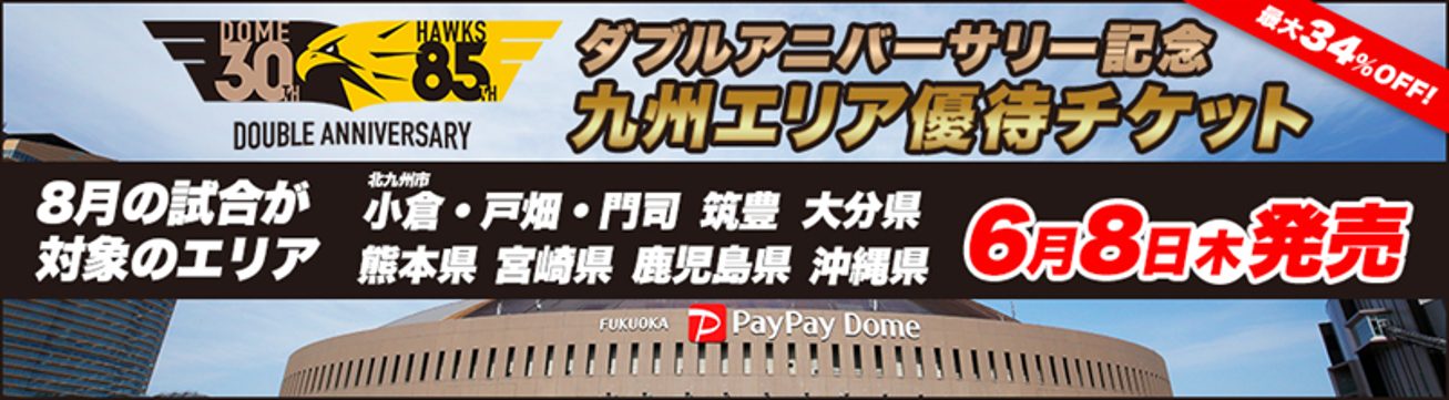 球団創設85周年&ドーム30周年という節目を記念して、九州8県(沖縄県含む)にお住まいの方々を対象に、日頃の感謝の気持ちを込めて「九州エリア優待チケット」を販売中。PayPayドームでの観戦をおトクに楽しんでもらえる最大34%OFFの応援感謝価格♪8月度は11試合を、北九州市小倉・戸畑・門司エリア、大分県・熊本県・宮崎県・鹿児島県・沖縄県、筑豊エリアにお住まいの方を対象に6月8日(木)12:00より販売します。
