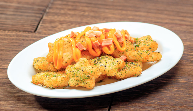 あおさと濃厚なチーズソース、アクセントに黒ゴマを入れ交流戦での対戦チームカラーをイメージしたトッピングにをホークスの勝利を祈った勝ち星にかけた逸品☆