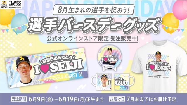 バースデーグッズは8月生まれの選手が受注スタート!推しの選手の誕生日を祝う特別なグッズを手に入れられるこのチャンスをお見逃しなく!昨年好評だったバースデーグッズのラインナップにタオルとキーチェーンを追加して販売中!