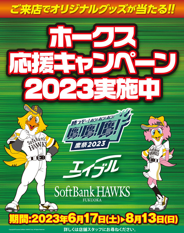 キャンペーン期間中、対象の店舗にご来店いただき、ご来店カードにご入力いただいた方の中からスピードくじにて、鷹の祭典2023観戦チケットやオリジナルコラボグッズなどが1店舗あたり29名様に当たります。また、ご来店いただいた方全員にエイブルとホークスのロゴ入りオリジナルウェットティッシュを1店舗あたり先着400名様にプレゼント!!