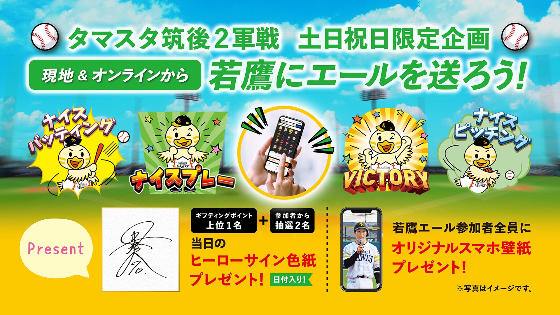 参加者にはオリジナル壁紙をプレゼント。さらに抽選で若鷹ヒーローの直筆サイン色紙も当たります。球場からでもオンラインからでも、ぜひ若鷹選手たちにエールを送ってください!