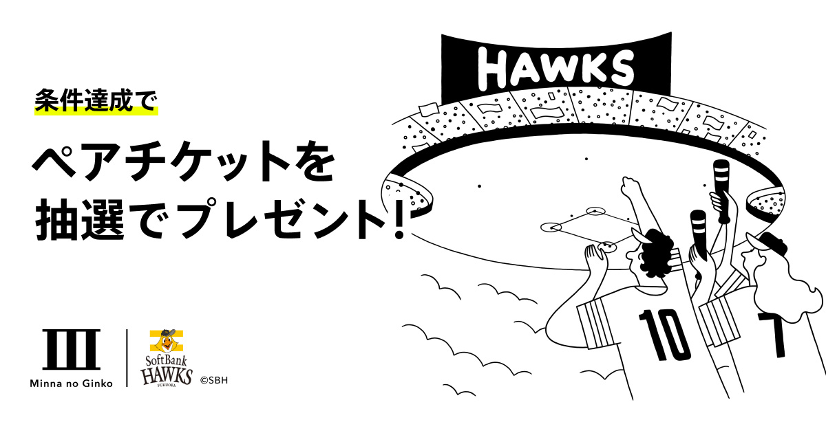ホークスの日本一奪還を祈念して、みんなの銀行によるホークス応援Boxキャンペーンを開催中!第4弾のキャンペーンでは、新規口座開設者のうち条件を達成した方の中から抽選で、PayPayドーム開催の観戦ペアチケットが当たります。ぜひこの機会にみんなの銀行口座を開設して、素敵な景品をゲットしましょう!