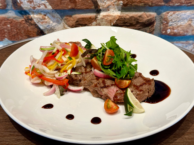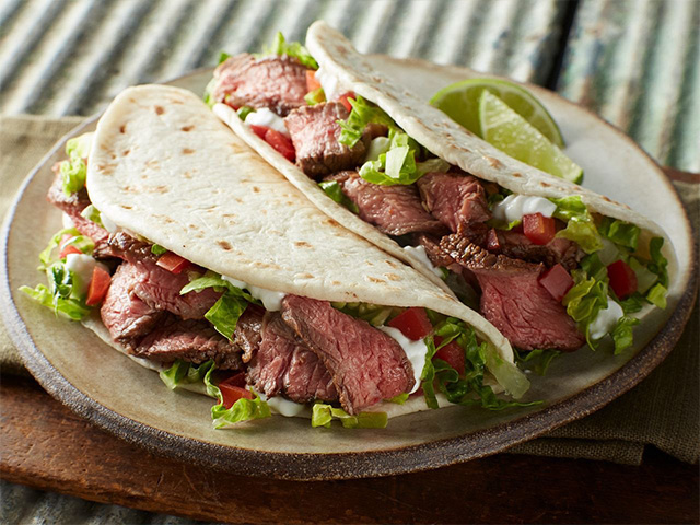 トルティーヤに牛ステーキと野菜をたっぷり盛り付けてご提供します。