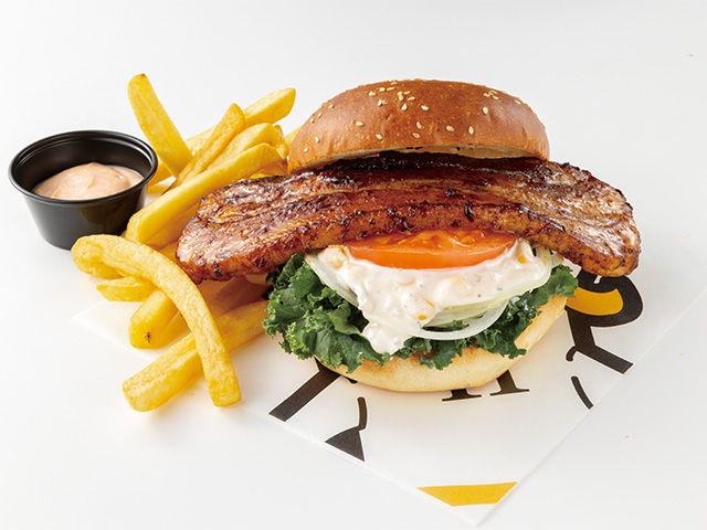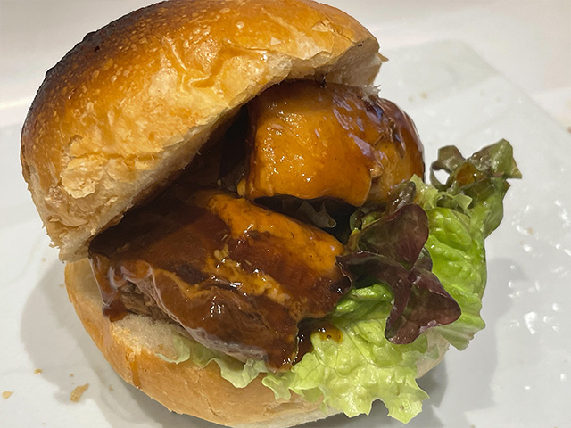 赤豚の角煮バーガー。霧島の赤豚をトロトロに煮たジューシーな角煮をバーガーにしました。