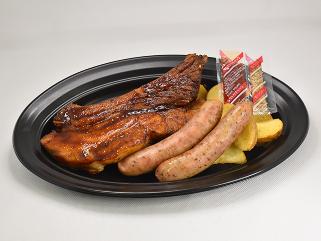 サーロインステーキ、スモークチキン、牛サガリ(にんにく醤油味)、豚肩ロース(ハーブソルト味)、厚切りベーコン、ソーセージ、牛パテ、バンズ、焼き野菜、ケイジャン枝豆