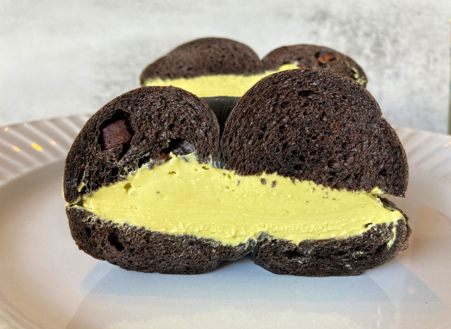 | 説明 | チョコレートをふんだんに使った人気のマンハッタンベーグルにエメラルドのピスタチオクリームチーズをサンドした限定メニュー |