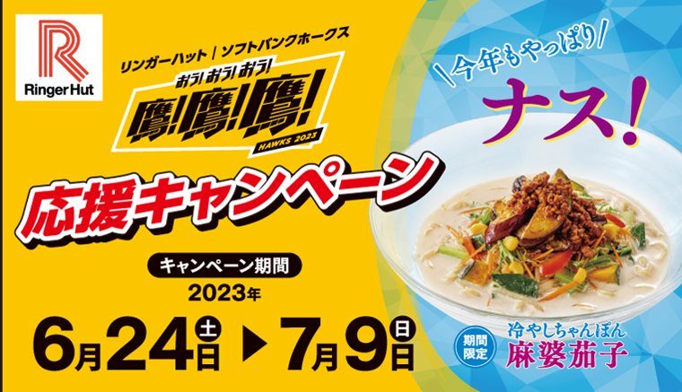 「冷やしちゃんぽん麻婆茄子」を食べて豪華賞品を当てよう!長崎ちゃんぽん専門店「リンガーハット」と「福岡ソフトバンクホークス」がコラボレーションしたキャンペーン「鷹!鷹!鷹!応援キャンペーン」を、九州8県と山口地区の「リンガーハット」151店舗にて、6月24日(土)から7月9日(日)まで実施します。