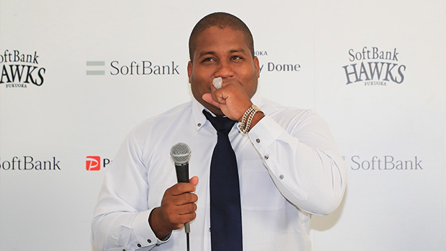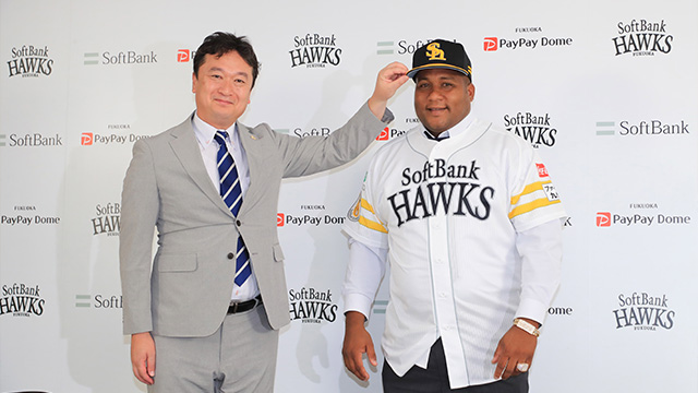 6月25日(日)アルフレド・デスパイネ選手(背番号25)の入団会見がPayPayドームで行われました。キューバ出身で2016年まで千葉ロッテマリーンズでプレー。2017シーズンから6年間ホークスに在籍し、打線の要として大活躍。チームの優勝に大きく貢献しファンにも愛されている助っ人です。
