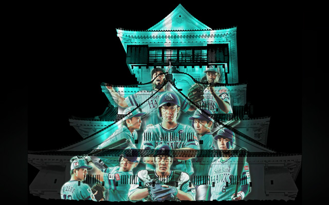 本取り組みは4年ぶりに実施するもので、今年はホークス球団創設85周年、北九州市制60周年をそれぞれ記念し、さらにグレードアップしました。エメラルドに込めた想い「再生」と「幸運」をテーマに、選手の勇ましいビジュアルや鷹祭2023ロゴ、北九州市制60周年ロゴなどを浮かび上がらせ、いつもと違う幻想的な小倉城にライトアップします。