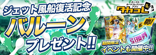 カードコレクションアプリタカコレでは、7月15日(土)より専用ポンプ付きの新仕様でジェット風船演出が復活することを記念して、タカコレアプリ内通貨であるバルーンを無料でプレゼント!バルーン割引セールなどの期間限定イベントも多数開催!