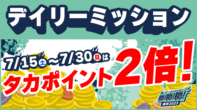 報酬のタカポイントが通常の2倍もらえます!日々のミッションを達成し、報酬を手に入れましょう!