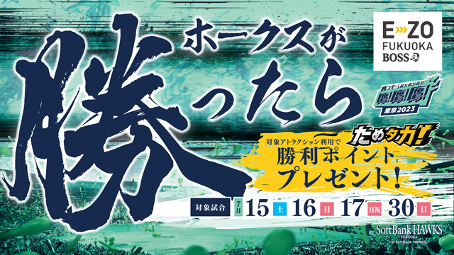 PayPayドーム開催の鷹の祭典デーゲームにて、ホークスが勝ったらBOSS E・ZOFUKUOKAの対象アトラクションご利用で、ためタカ!勝利ポイントを100ptプレゼント!