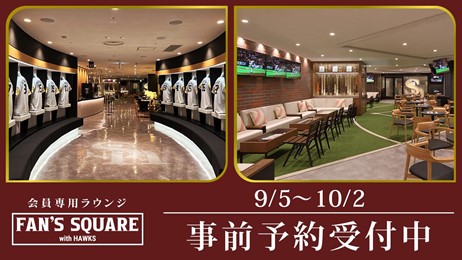 タカポイントでは、当日の観戦チケットをお持ちのダイヤモンド・プラチナステージ会員を対象に、9月5日(火)~10月2日(月)にPayPayドームで開催される公式戦における会員専用ラウンジ「FAN’S SQUARE」事前予約の抽選受付を開始いたします。