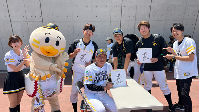 - ※上記とは別に若鷹選手によるファンサービス(始球式やオンユアマークス、ハイタッチなど)の抽選は「ホークス筑後ファンクラブ会員」を対象に実施いたします。