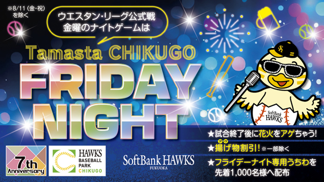 7月21日(金)より、タマスタ筑後での金曜日ナイトゲーム開催の2軍公式戦を対象に開催しているイベント「フライデーナイト」。※8月11日(金・祝)を除く