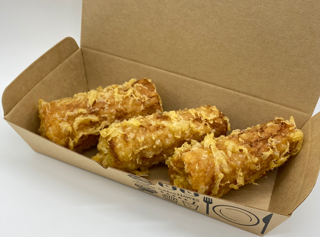 「お弁当のヒライ」さま考案のB級グルメがタマスタ筑後に降臨!ポテトサラダをちくわに入れて、天ぷらにした商品です。