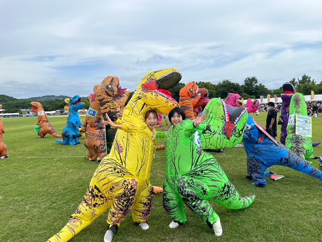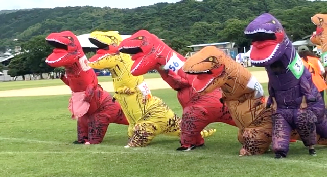 ティラノサウルスレースはアメリカ発祥とされるティラノサウルスの着ぐるみを着て競走する競技で、日本でもSNSなどで話題になって注目され、各地の地域イベントなどで開催されています。 ティラノサウルスの着ぐるみに身を包み、ドーム内に設けられた特設コース(50m)を走り、順位を競います。ティラノサウルスたちが爆走!爆笑?これぞまさに競竜!